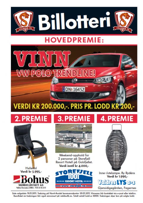 Årets billotteri har en VW Polo Trendline med ekstra vinterdekk og valgfri metaliclakk som hovedpremie. Vi er nå igang. Her finner du oss.