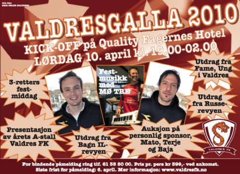 Fotballsesongen i 2010 har vært meget spennende sportslig for Valdres FK sine lag. Vi har fornyet kontrakt i 2.divisjon og Interkrets Junior Elite og opprykk til 3. divisjon Damer. Dette må feires! Fotballavslutningen er et lukket arrangement med spesielt inviterte.