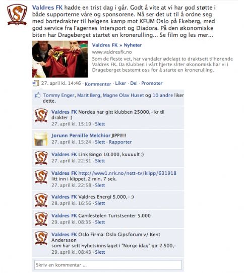 Som de fleste vet, har vandaler ødelagt to draktsett tilhørende Valdres FK.Da Klubben i vårt hjerte sliter økonomisk har vi i Drageberget bestemt oss for å starte en kronerulling. Nordea Bank i Valdres gir 25.000 kroner til Valdres FK for innkjøp av nye spilledrakter etter hærverket.